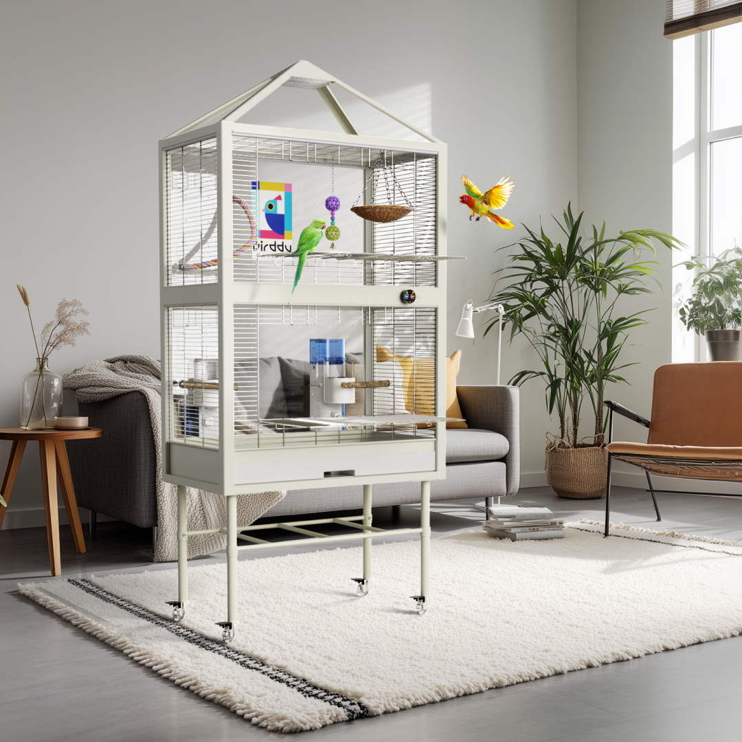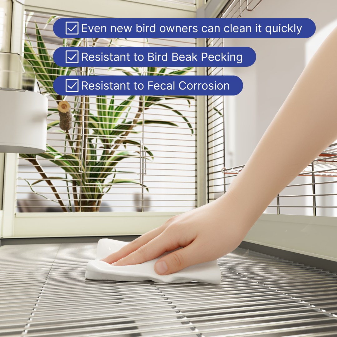 Crafted from food-grade 304 stainless steel, our smart birdcage boasts durability and corrosion resistance for a long-lasting premium finish. Its smooth, non-porous surface repels debris and droppings, allowing you to restore showroom-level cleanliness in seconds with just a damp cloth.